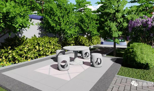 阜阳景画园林郑景龙设计石桌石凳一套,放置在院落偏东的位置,同时通往石凳石桌的地面进行硬质化。风水顾问李银河强调,石凳和石桌放在卯山的作用,要超过假山的作用,因为结合客户的属相,需要增补艮土的力量,起到催财旺运的作用。